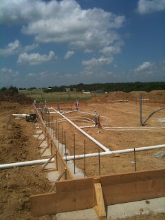 So, once the loan got done, work on the house has flown by. This week they have gotten the footings for the foundation laid and approved. The plumbing and electric are roughed in. The water line has been run from the street to the house. They come in tomorrow for rebar, etc. to get ready to pour the foundation on Monday or Tuesday next week. It's very exciting! Can't wait to see the foundation poured. I'll be sure to post those pictures when they are available. For now, here is some of the recent progress...
